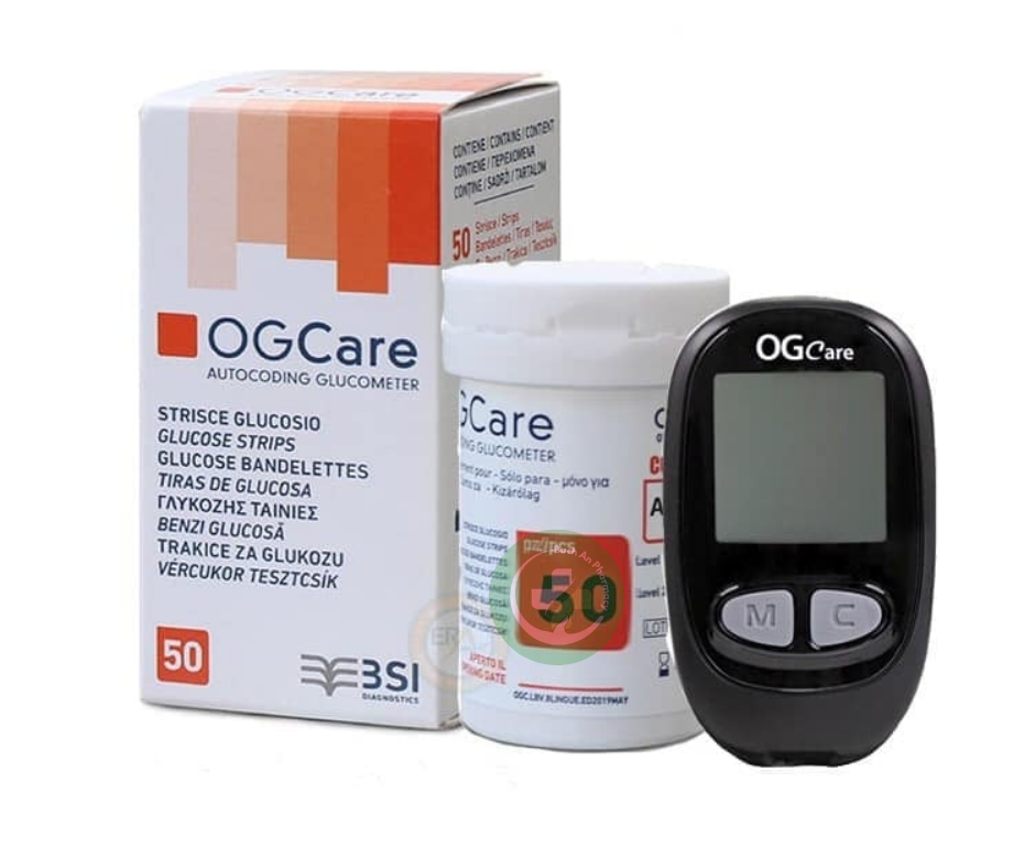 Máy đo đường huyết OGCARE dùng phương pháp Glucose Oxidase amperometric, tự bật khi cắm que, ejector que tránh nhiễm khuẩn. Màn hình LCD rộng (backlight tùy chọn), cảnh báo Hi/Lo, không Bluetooth chuẩn nhưng có USB truyền dữ liệu PC.