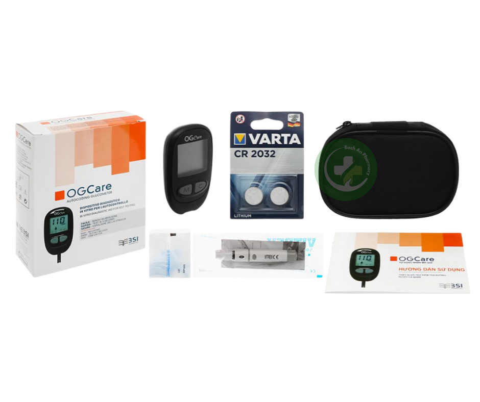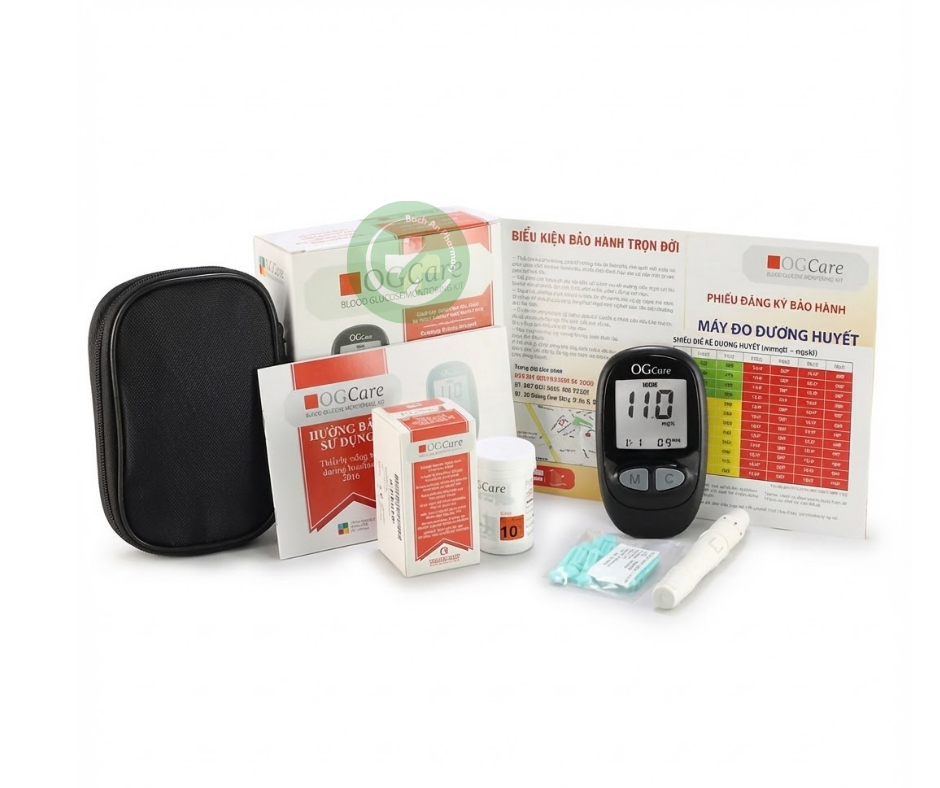 Máy đo đường huyết OGCARE giữ 10-40°C, 10-90% RH hoạt động; lưu 5-30°C que. Tháo pin lâu không dùng, lau khăn mềm cồn.
