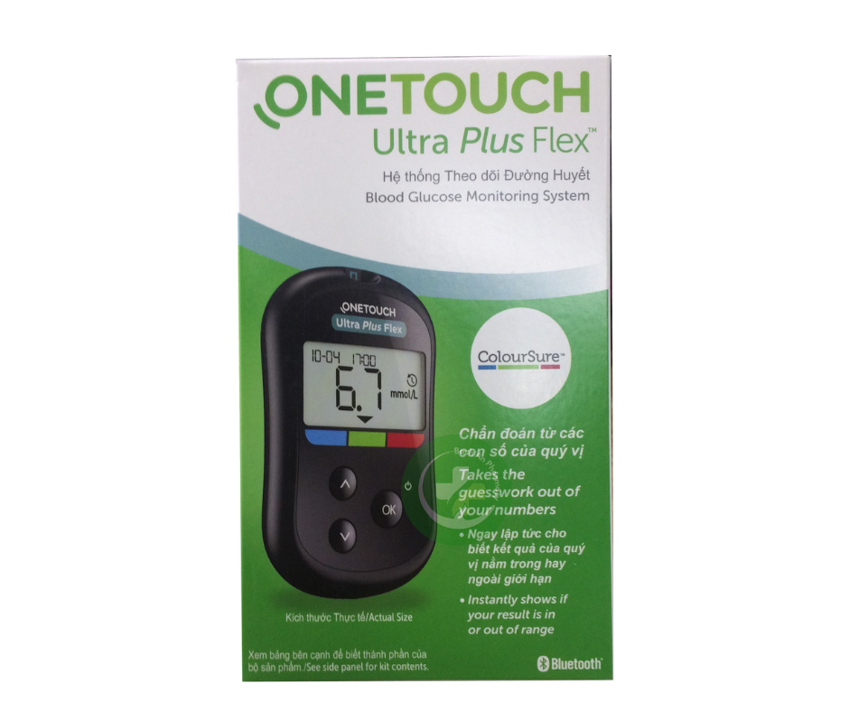 Máy đo đường huyết OneTouch Ultra Plus Flex dùng đo glucose fresh capillary fingertip cho người tiểu đường tự theo dõi tại nhà, hỗ trợ quản lý hiệu quả điều trị. Không dùng chẩn đoán, screening diabetes hoặc neonatal, chỉ single-patient. ColorSure hiển thị range ngay lập tức giúp quyết định nhanh.