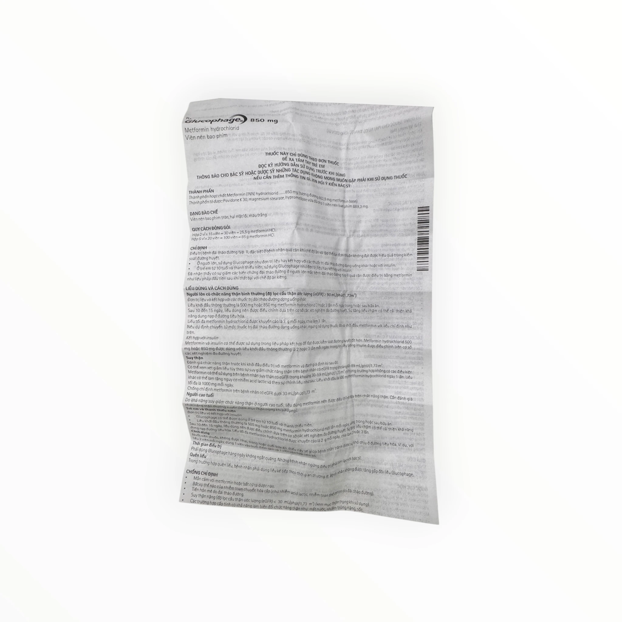 Liều khởi đầu thông thường là 500 mg hoặc 850 mg metformin hydrochloride 2 hoặc 3 lần mỗi ngày trong hoặc sau bữa ăn. Sau 10 đến 15 ngày, liều dùng nên được điều chỉnh dựa trên cơ sở các xét nghiệm đo đường huyết. Sự tăng liều chậm có thể cải thiện khả năng dung nạp ở đường tiêu hóa. Liều tối đa metformin hydrochloride được khuyến cáo là 3 g mỗi ngày, chia làm 3 lần. Kết hợp với insulin: Metformin và insulin có thể được sử dụng trong liệu pháp kết hợp để đạt được kiểm soát đường huyết tốt hơn. Metformin hydrochlorid 500 mg hoặc 850 mg được dùng với liều khởi đầu thông thường là 2 hoặc 3 lần mỗi ngày, trong khi liều lượng insulin được điều chỉnh trên cơ sở các xét nghiệm đo đường huyết. Suy thận: Đánh giá chức năng thận trước khi khởi đầu điều trị với metformin và đánh giá định kỳ sau đó. Có thể xem xét giảm liều tùy theo sự suy giảm chức năng thận trên bệnh nhân có eGFR khoảng 60-89 mL/phút/1,73 m². Metformin có thể sử dụng trên bệnh nhân suy thận có eGFR trong khoảng 30-59 mL/phút/1,73 m²: Liều khởi đầu là 500 mg metformin hydrochlorid ngày 1 lần. Liều tối đa là 1000 mg mỗi ngày. Chống chỉ định metformin trên bệnh nhân có eGFR dưới 30 mL/phút/1,73 m². Người cao tuổi: Do khả năng suy giảm chức năng thận ở người cao tuổi, liều dùng metformin nên được điều chỉnh dựa trên chức năng thận. Cần đánh giá chức năng thận thường xuyên. Trẻ em và thanh thiếu niên: Glucophage có thể dùng ở trẻ em từ 10 tuổi và thanh thiếu niên. Liều khởi đầu thông thường là 500 mg hoặc 850 mg metformin hydrochlorid một lần mỗi ngày, uống trong hoặc sau bữa ăn. Sau 10 đến 15 ngày, liều dùng nên được điều chỉnh. Liều tối đa 2 g mỗi ngày, chia làm 2 hoặc 3 lần. Cách dùng: Nuốt viên thuốc, không được nhai, trong hoặc cuối bữa ăn. Thời gian điều trị: Phải dùng Glucophage hàng ngày không ngắt quãng.