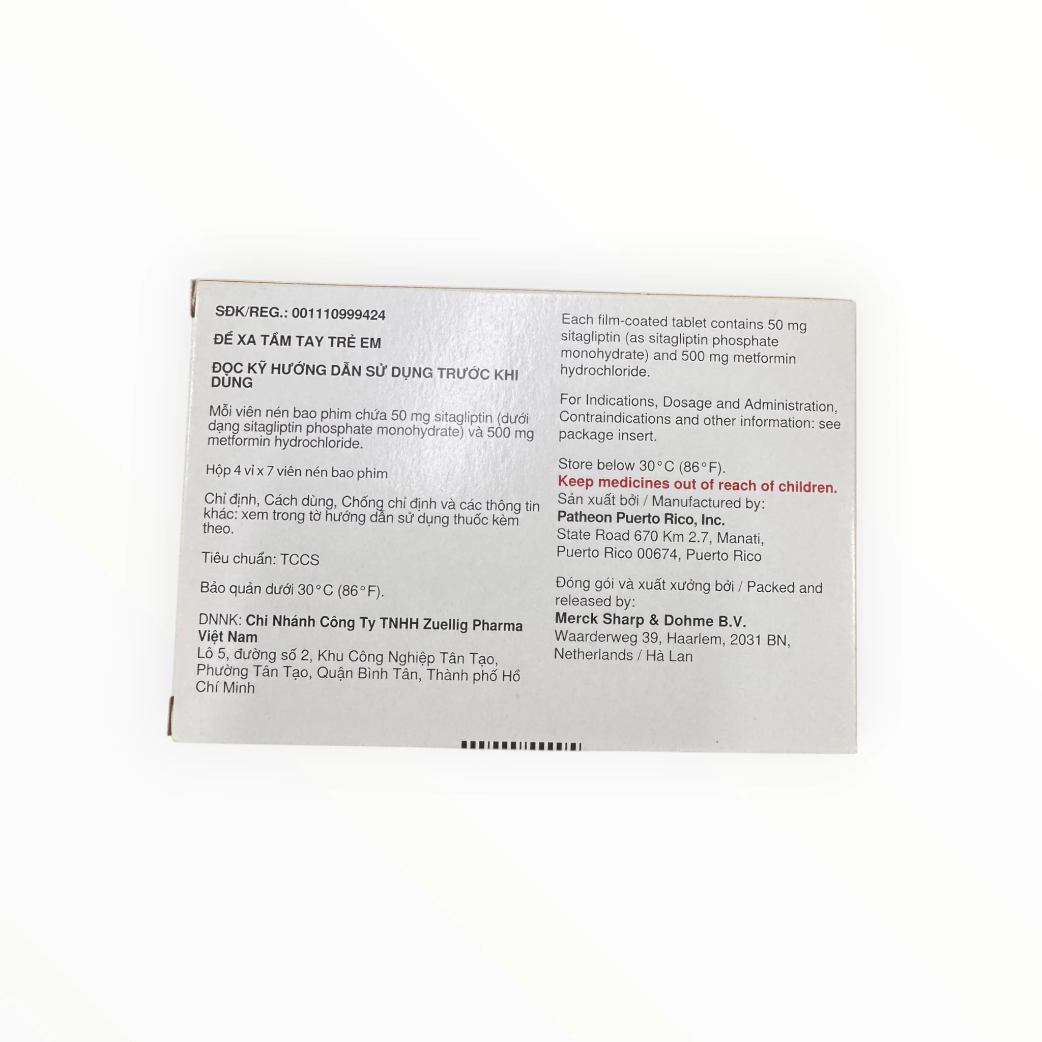 | Mỗi viên nén bao phim chứa (sitagliptin (dưới dạng sitagliptin phosphate monohydrate) và 500 mg metformin hydrochloride) | 50 mg | Hoạt chất |