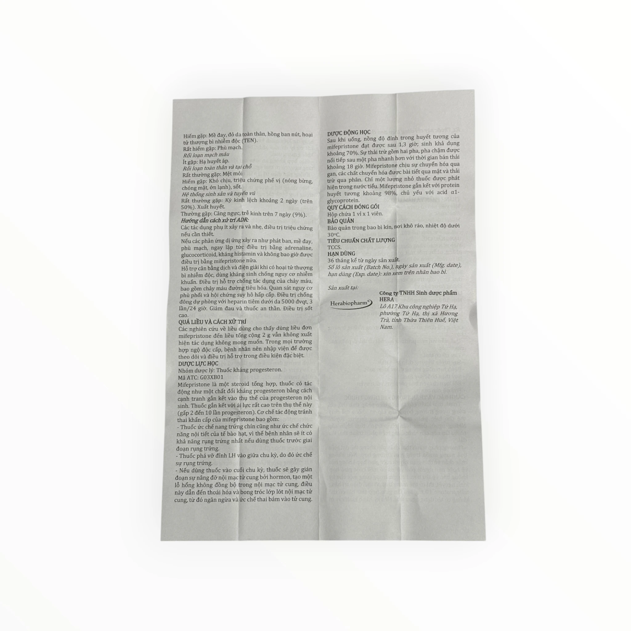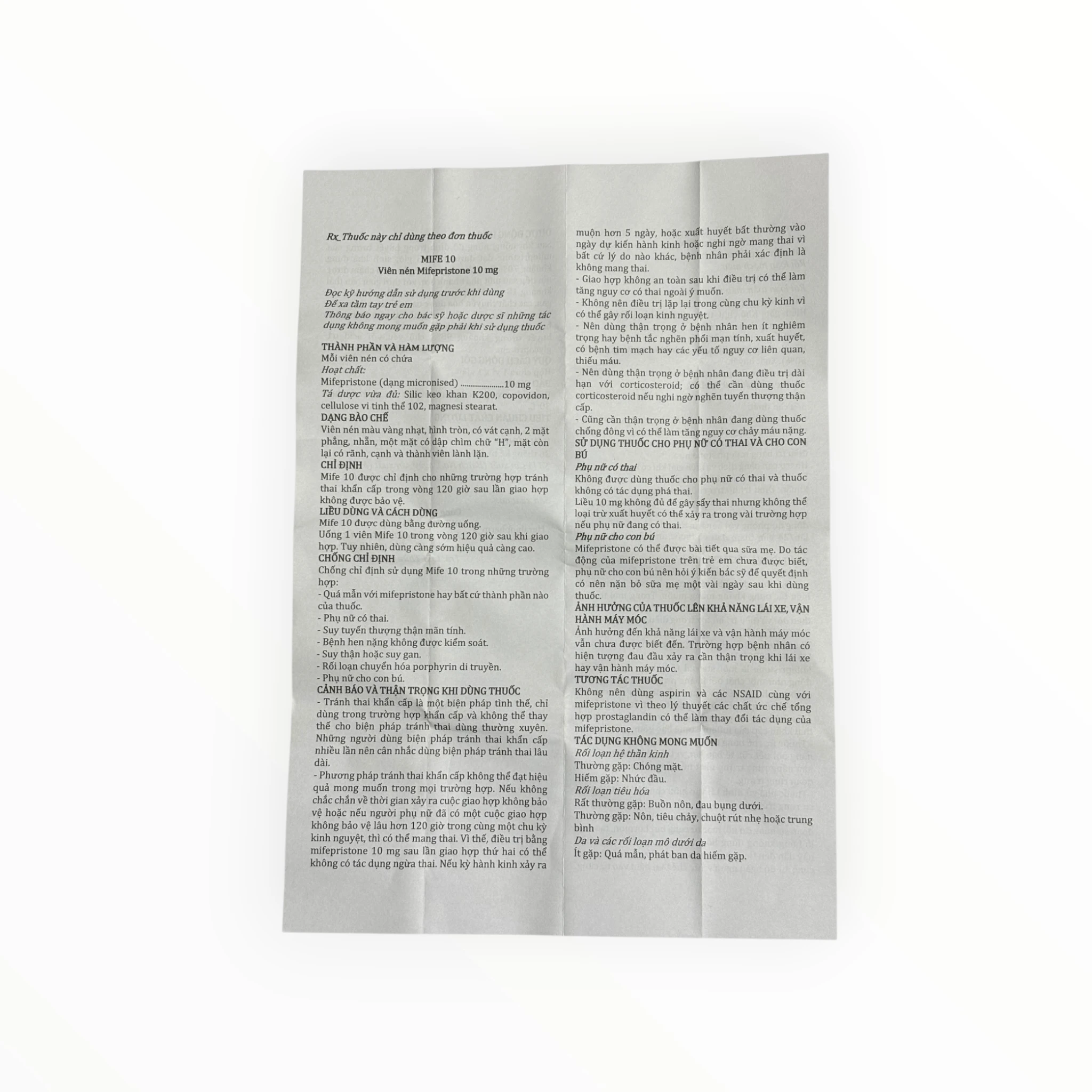 | Mifepristone | 10,0 mg | Hoạt chất |